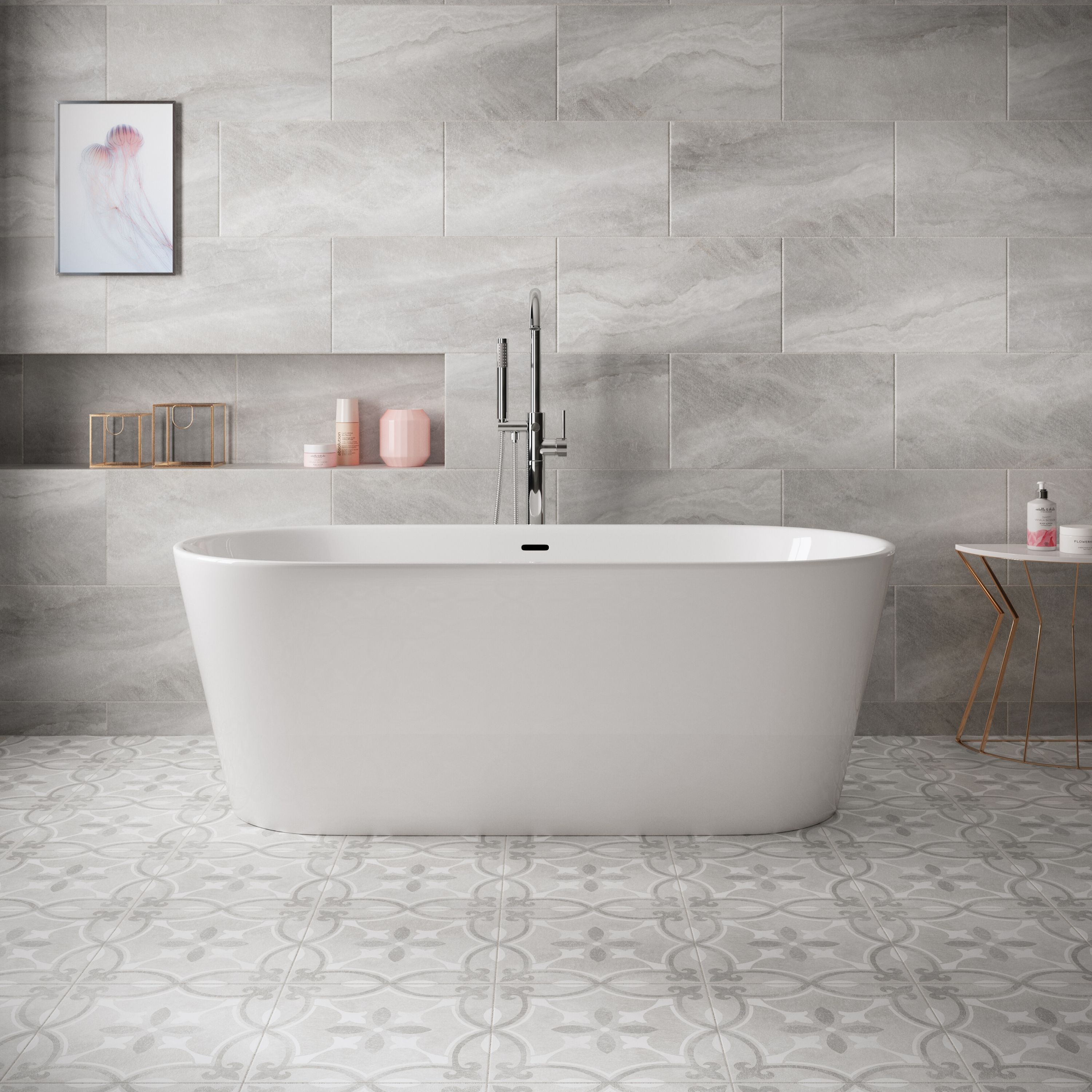It's not overly feminine nor masculine.the subway shower tile alternates white and gray tile for some fun and movement, and a round mirror contrasts the square vanity. From moroccan to victorian, geo They create the setting, look, and feel of the room, and are also an important part of your home's cohesive style. To help you make the right tile choice we're happy to provide up to 4 free samples.if you can't see what you're looking for please contact the direct tile warehouse team, we're sourcing new patterned tiles all the time. 'life's too short to live in a beige box' is the motto of our patterned tiles, if they had a motto.