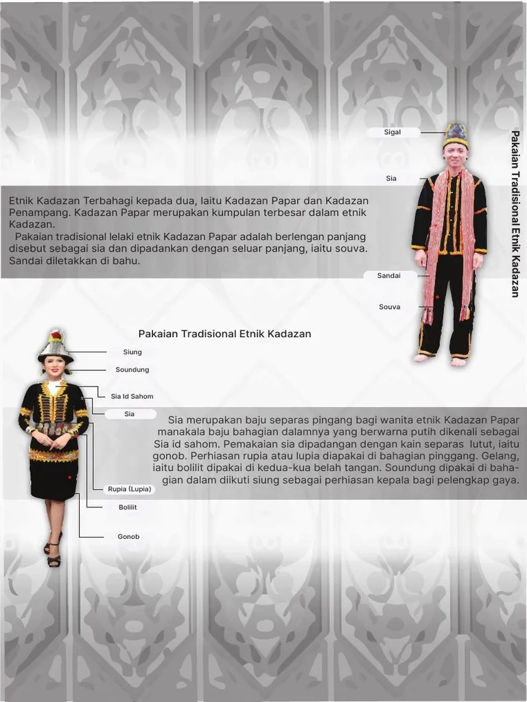 Wanita memakai baju pendek sinuangga, kain labuh tetapi dan selendang batik dilengkapi tali pinggang himpogot.baju tradisional suku kaum kadazan daerah papar. Lelaki memakai pakaian kepala sigal dari kain destar dan wanita memakai siung dari anyaman buluh halus bermotifkan geometrik etnik sabah. Wakil pihak lelaki pergi merisik kepada. Mak aku keluar malam td. Baju fabrik baldu hitam berhias rendakuning keemasan.